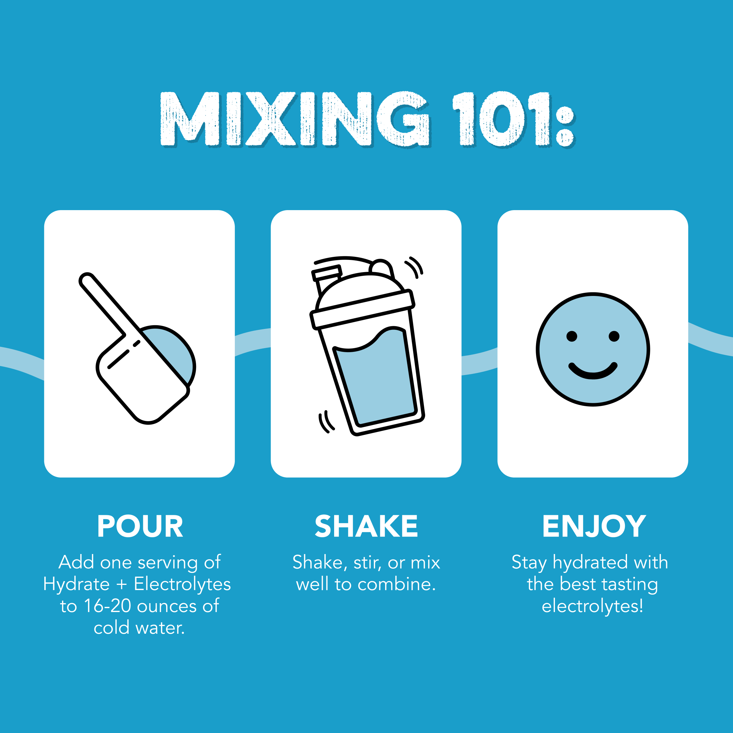 HOW TO USE: Add one serving of Hydrate + Electrolytes to 16-20 oz. of cold water. Mix well and enjoy one serving per day.